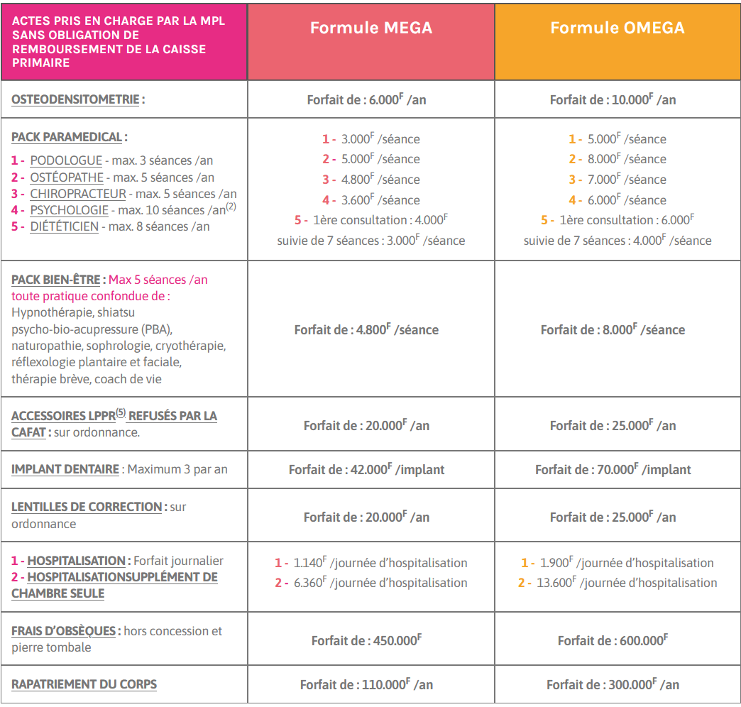 (2) - À l’étranger sur présentation du rejet de la Cafat, possibilité de remboursement sur avis de notre médecin conseil. Frais pris en charge : soins médicaux réalisés pendant la cure + forfait de surveillance médicale.