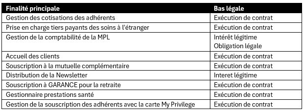 Le tableau de traitement en Annexe précise à quelles fins sont traitées vos Données. Les informations collectées sont réservées à l’usage de la MPL et ne seront aucunement vendues ou échangées à des tiers.